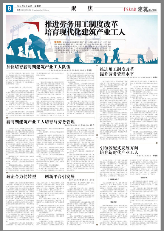 日前,《中国建设报》建筑半月谈8月31日专版聚焦“推进建筑劳务用工制度改革,培育现代化建筑产业工人”。在头条位置刊登了我会副会长兼秘书长邢作国的文章《加快培育新时期建筑产业工人队伍》,以及我会理事唐新球等同志的文章《政企合力促转型创新平台引发展》。《中华建筑报》8月28日以《建筑业步入新时代 农民工加速向建筑产业工人转型》为题在头版头条和第二版显要位置刊登了采访我会负责人的专题报道。